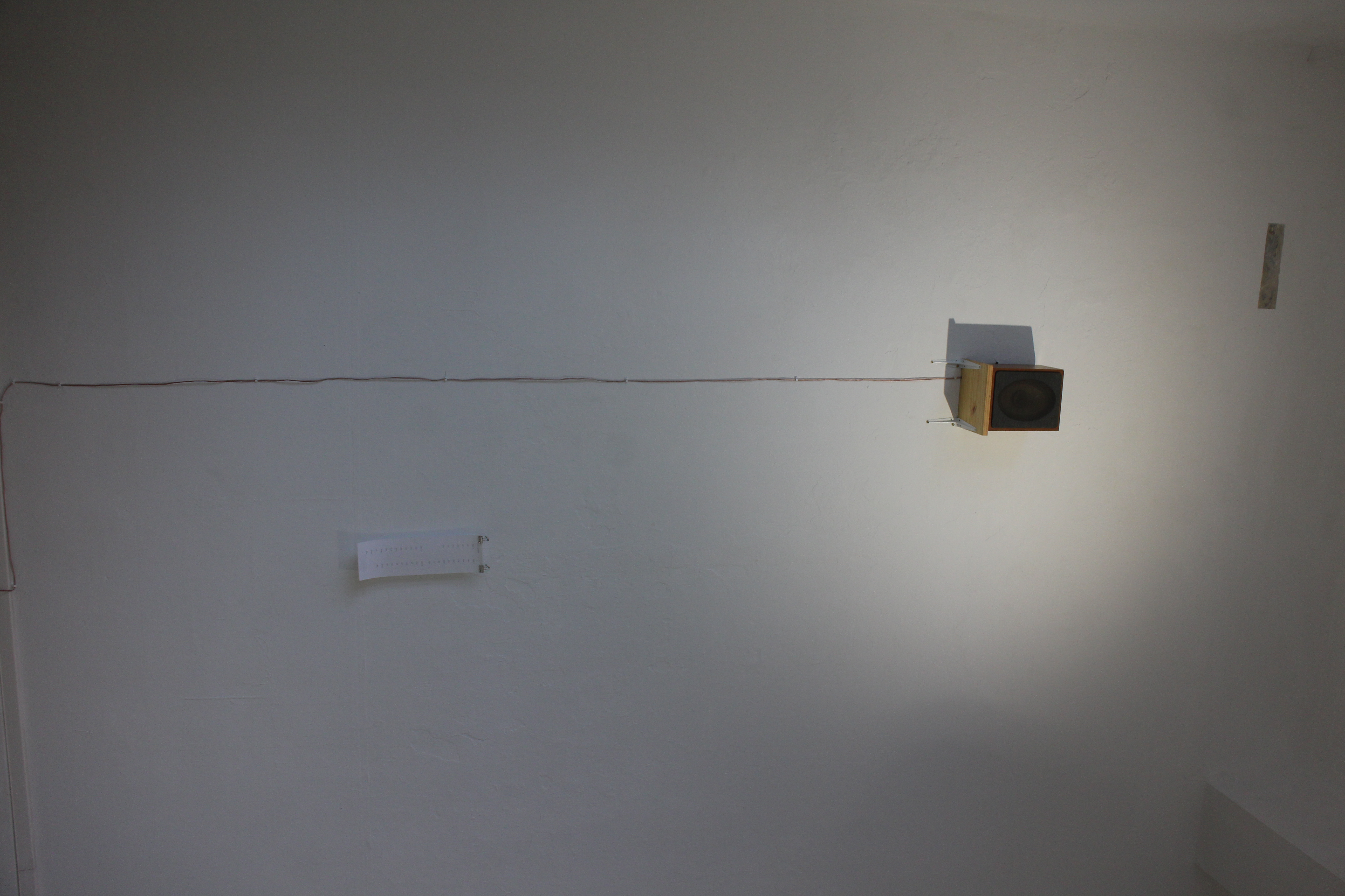 (7’’ audio loop, rewired car radio, cinderblock, printed text on paper)